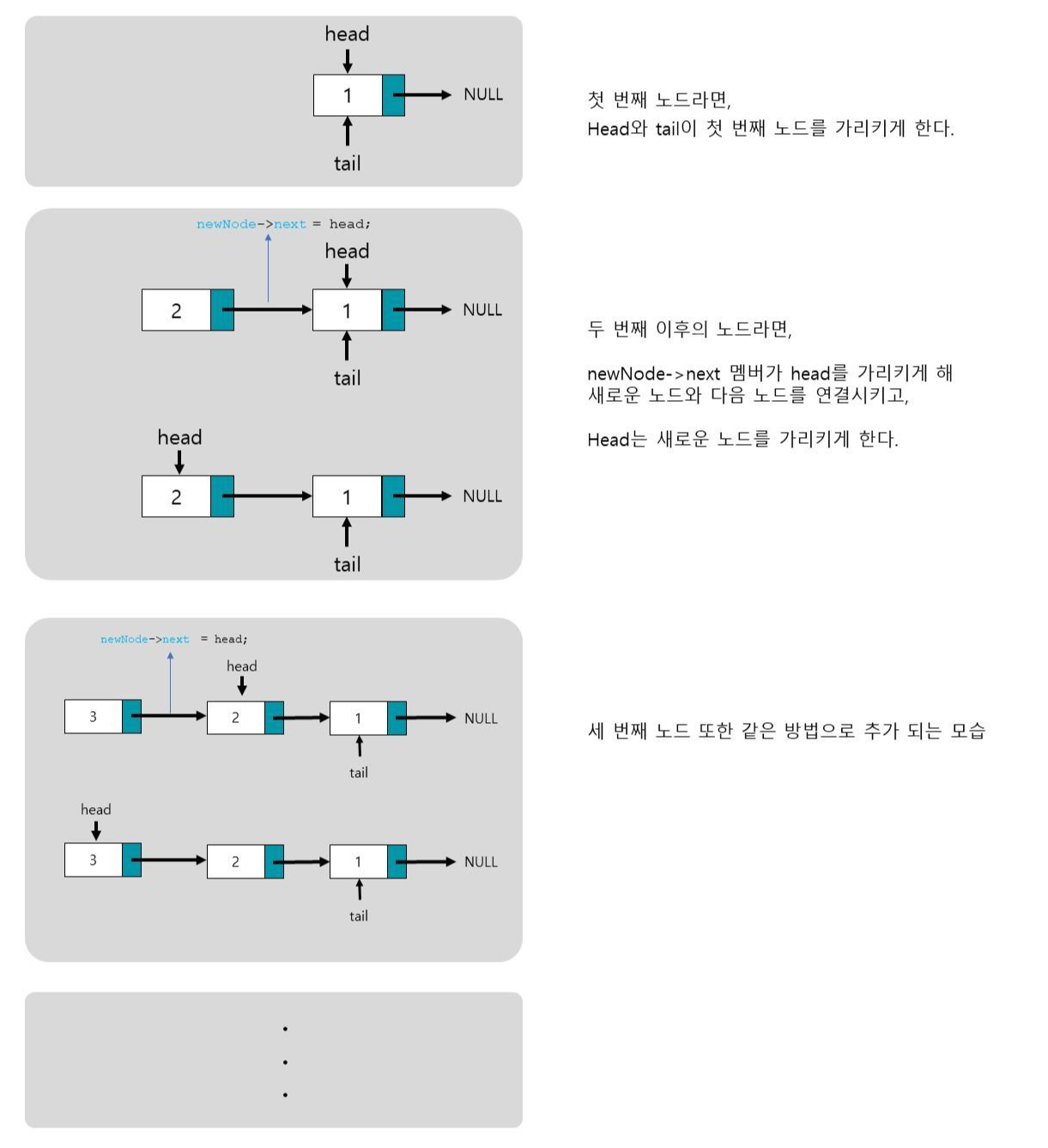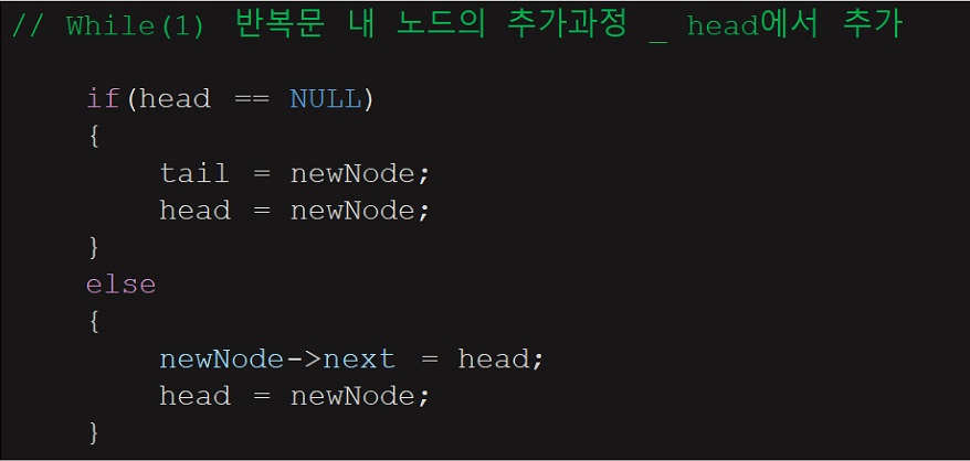 head에서 추가되는 방법은 head 포인터가 움직인다는 점이 다르다.