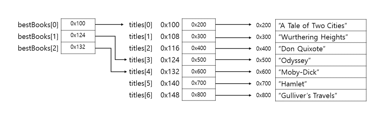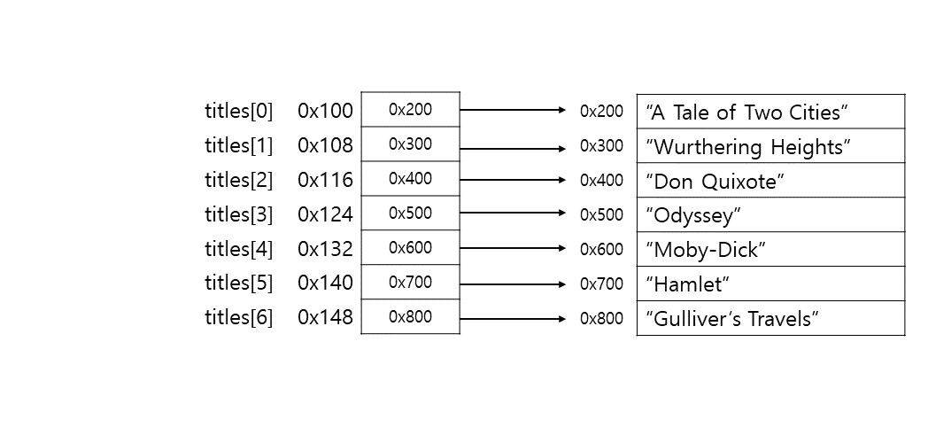 예를 들어, titles[0] 의 주소는 0x100 이며, titles[0]은 0x200 이라는 주소를 가리킨다.