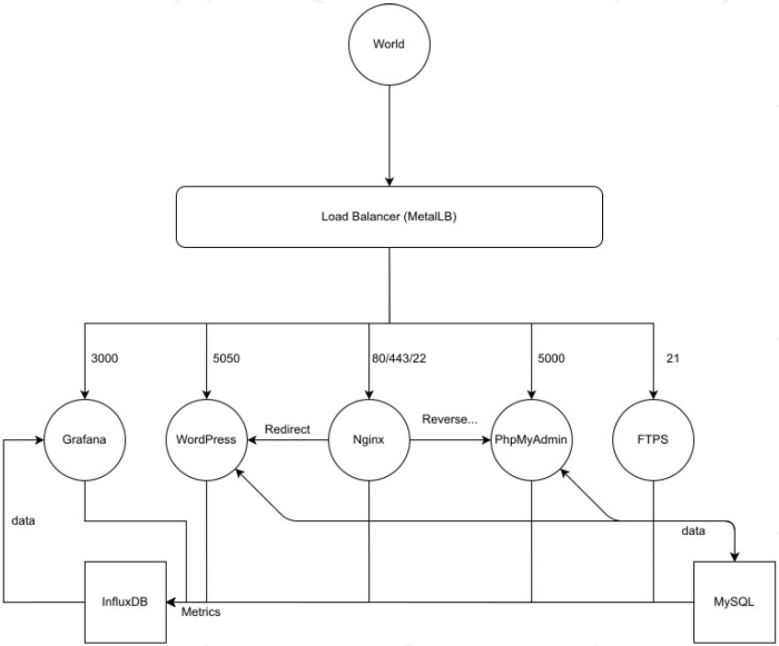 ft_services는 각 서비스마다 컨테이너를 만들고, 쿠버네티스를 이용해 각 서비스들을 관리할 수 있게 만들어 하나의 "클러스터"를 구현하는 과제이다.