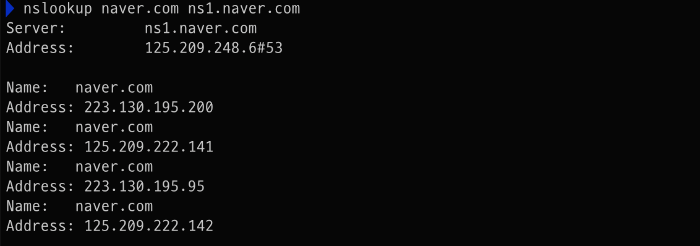 Recursive query 를 거쳐 얻은 ip 주소는 Authoritative DNS Server 에서 받은 정보인 데에 비해, 아래 nslookup naver.com 명령의 결과는 Local DNS Server 에 캐싱된 정보라는 의미에서 Non-authoritative answer 라고 나오는 것이다.