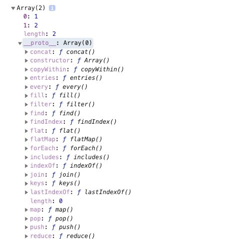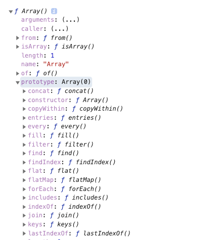 - 생성자함수 Array 의 prototype 메서드들과 인스턴스 arr의 __proto__ 메서드가 동일함을 볼 수 있다. 프로토타입 덕분에 배열을 선언한 후에 push, pop, forEach 와 같은 메서드들을 배열에 바로 사용할 수 있는 것이다.